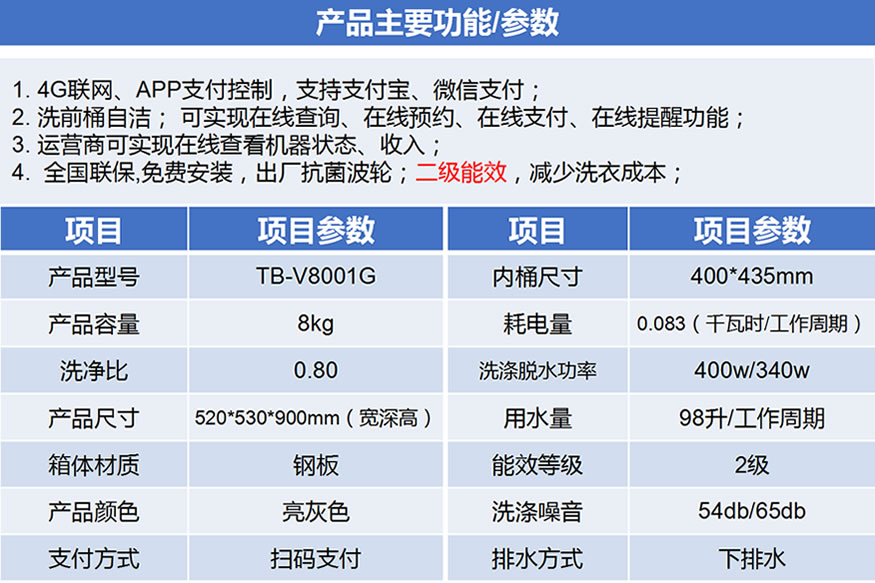 4、全國(guó)聯(lián)保,免費(fèi)安裝,出廠抗菌波輪;二級(jí)能效,減少洗衣成本。