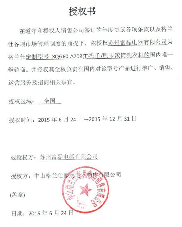 在遵守和授權(quán)人銷售公司簽訂的年度協(xié)議各項條款以及格蘭仕各項市場管理制度的前提下,茲授權(quán)蘇州富磊電器有限公司為格蘭仕定制型號XQG60-708(T)投幣/刷卡滾筒洗衣機的國內(nèi)唯一經(jīng)銷商。并授權(quán)其全權(quán)負責(zé)在國內(nèi)對該型號產(chǎn)品進行推廣、銷售、運營服務(wù)及招商相關(guān)事宜。